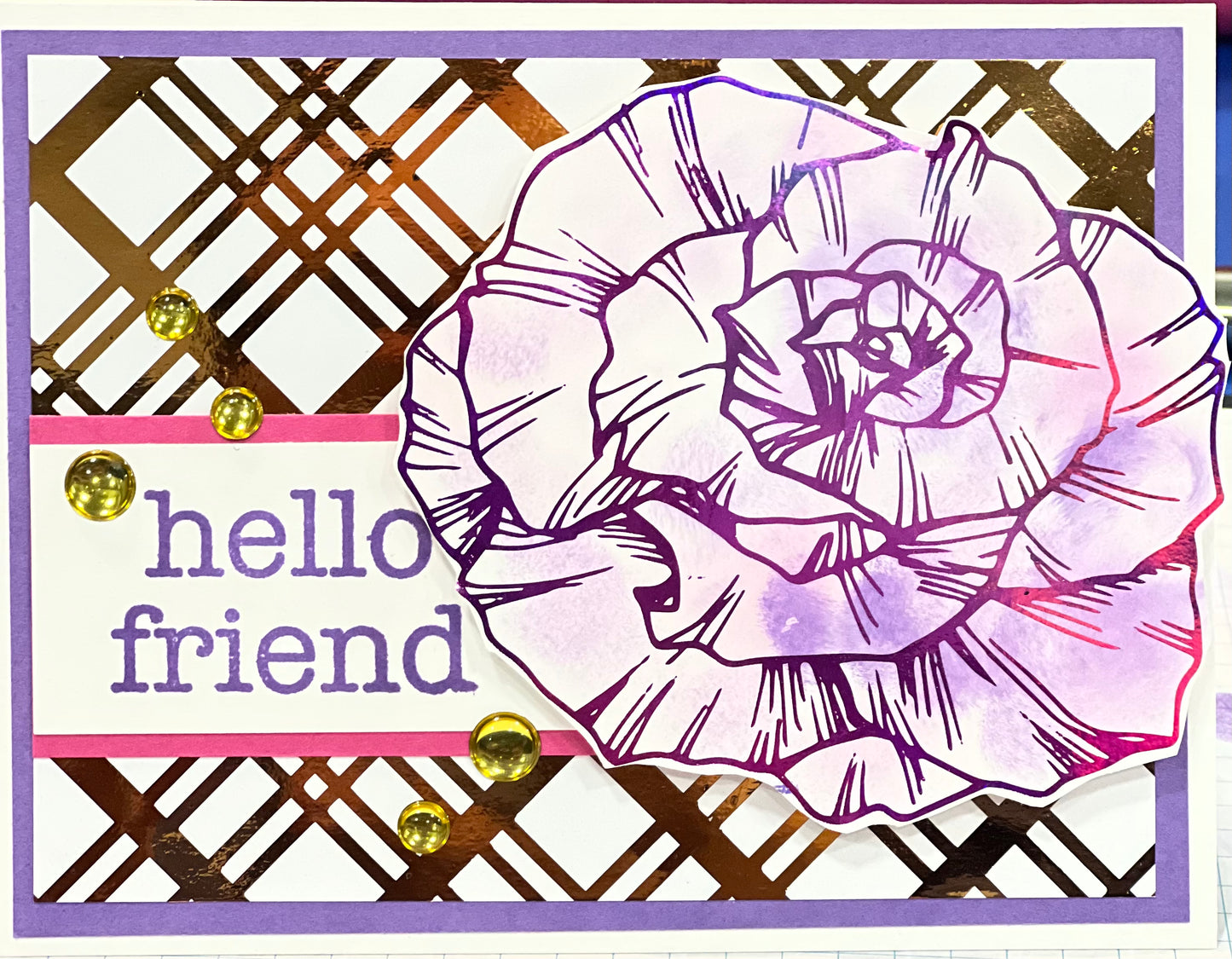 Stipple effect is used to color a flower in pinks and purples. A gold shiny plaid background holds a sentiment: Hello friend. Gold jewels finish off the card. Handmade.