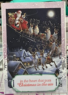 Santa is making his midnight run with his reindeer pulling his sleigh. Sentiment reads: in the heart that puts Christmas in the air. Handmade.