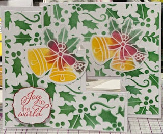 A stair stepper card opens to reveal gold bells on a backdrop of holly and berries. Sentiment reads: Joy to the World. Handmade.