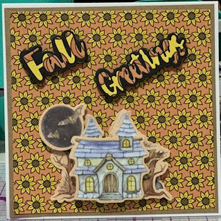 A decoupage spooky house greets the receiver with a Fall Greetings message on a bed of sunflowers. Handmade.