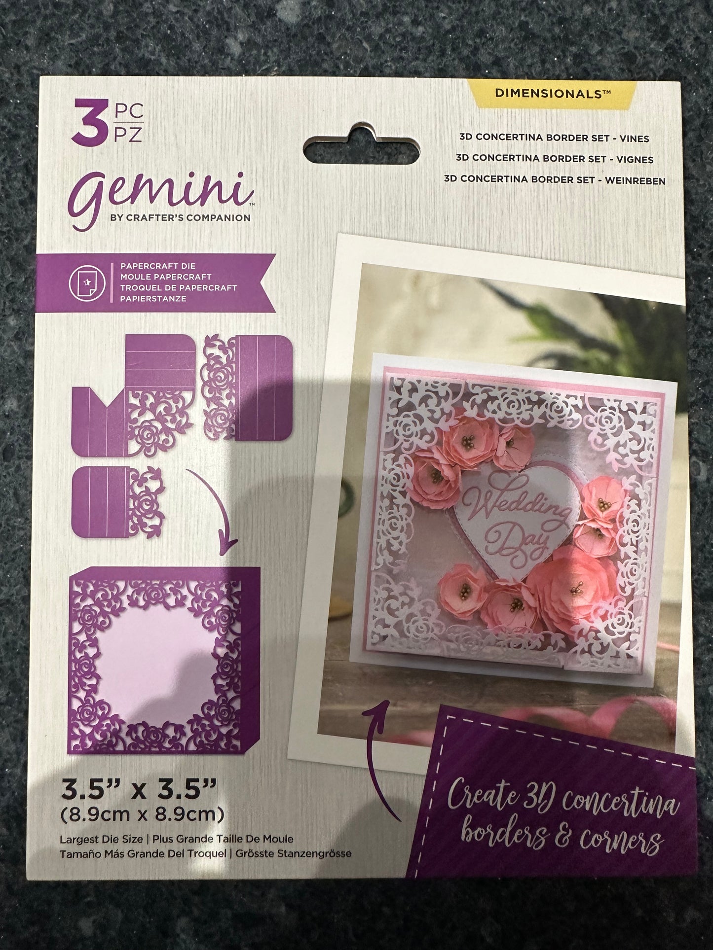 This 3-D gift box features a concertina border of vines. Perfect for gift giving. The largest die measures 3.5" x 3.5".