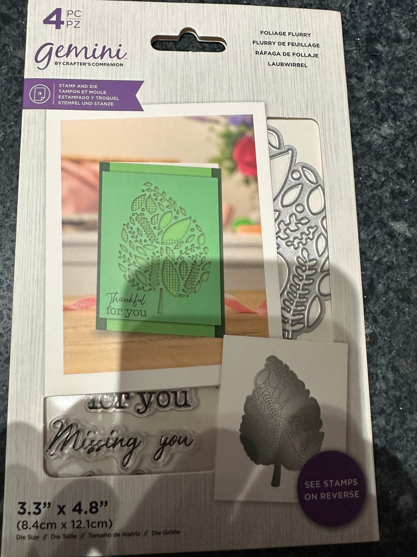 This stamp and die pack includes a detailed leaf that could be used as an aperture or an overlay to designer paper. Three sentiments include: Thankful for you, Missing you, and Thank you.