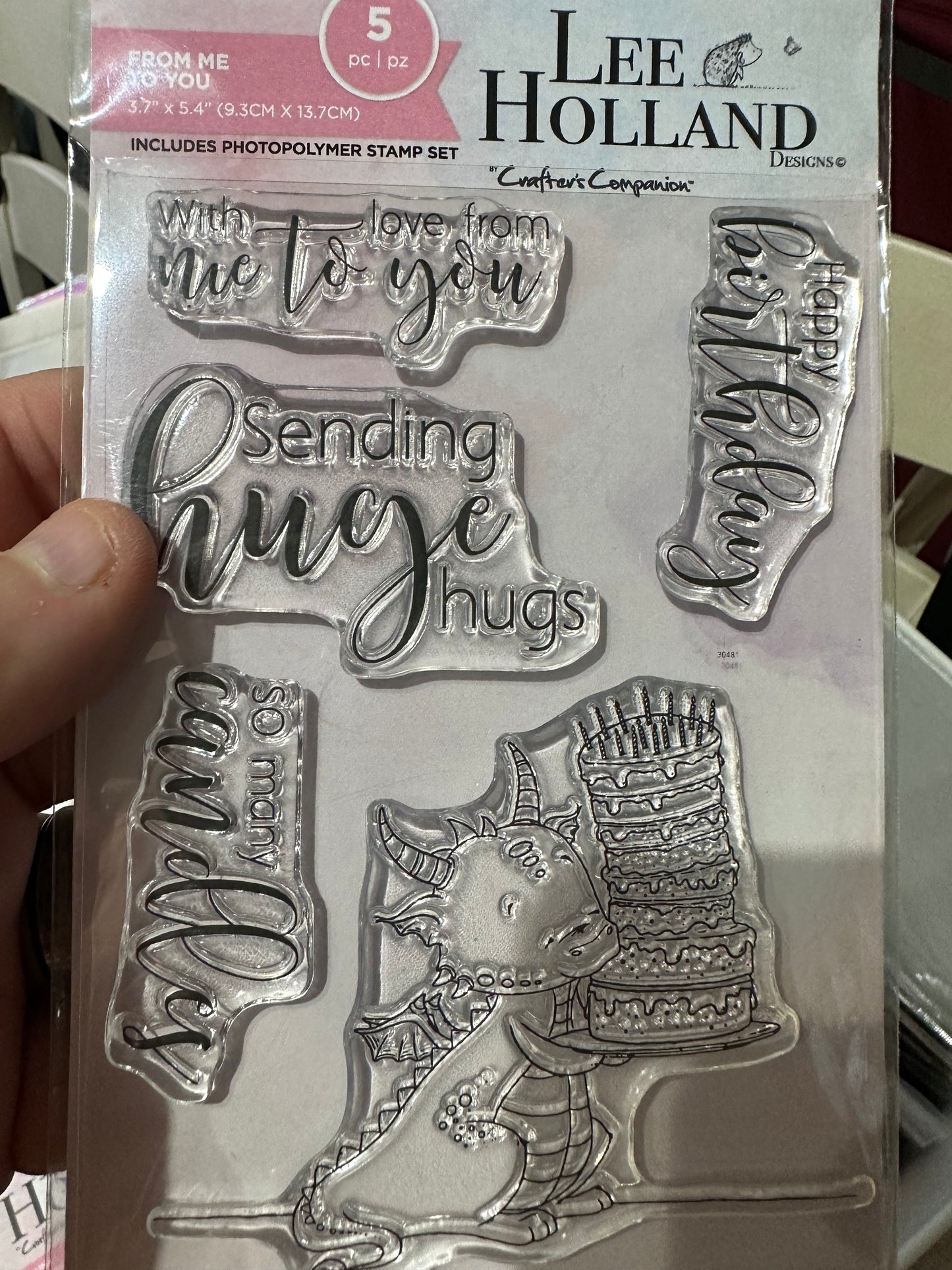 Dragon is carrying a birthday cake with four sentiments: "With love from me to you", "Sending huge hugs", "Happy birthday", and "So many candles".