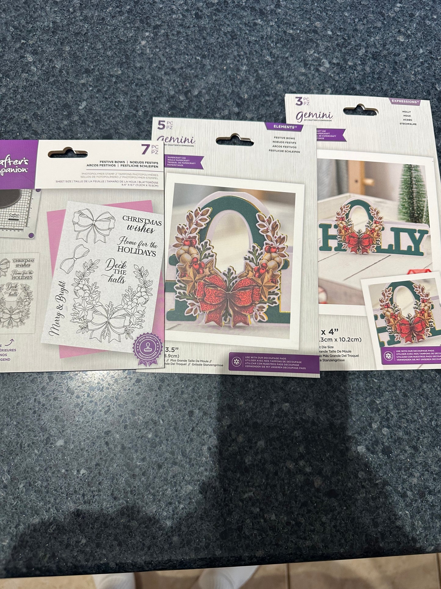 This three-piece bundle is a decoupage set sitting atop the word "Holly". The first package is the word card "Holly", the second is the decoupage stamps to create various arrangements and add-on sentiments, and the third is the dies to cut out the stamps. SOLD AS A COMPLETE SET.
