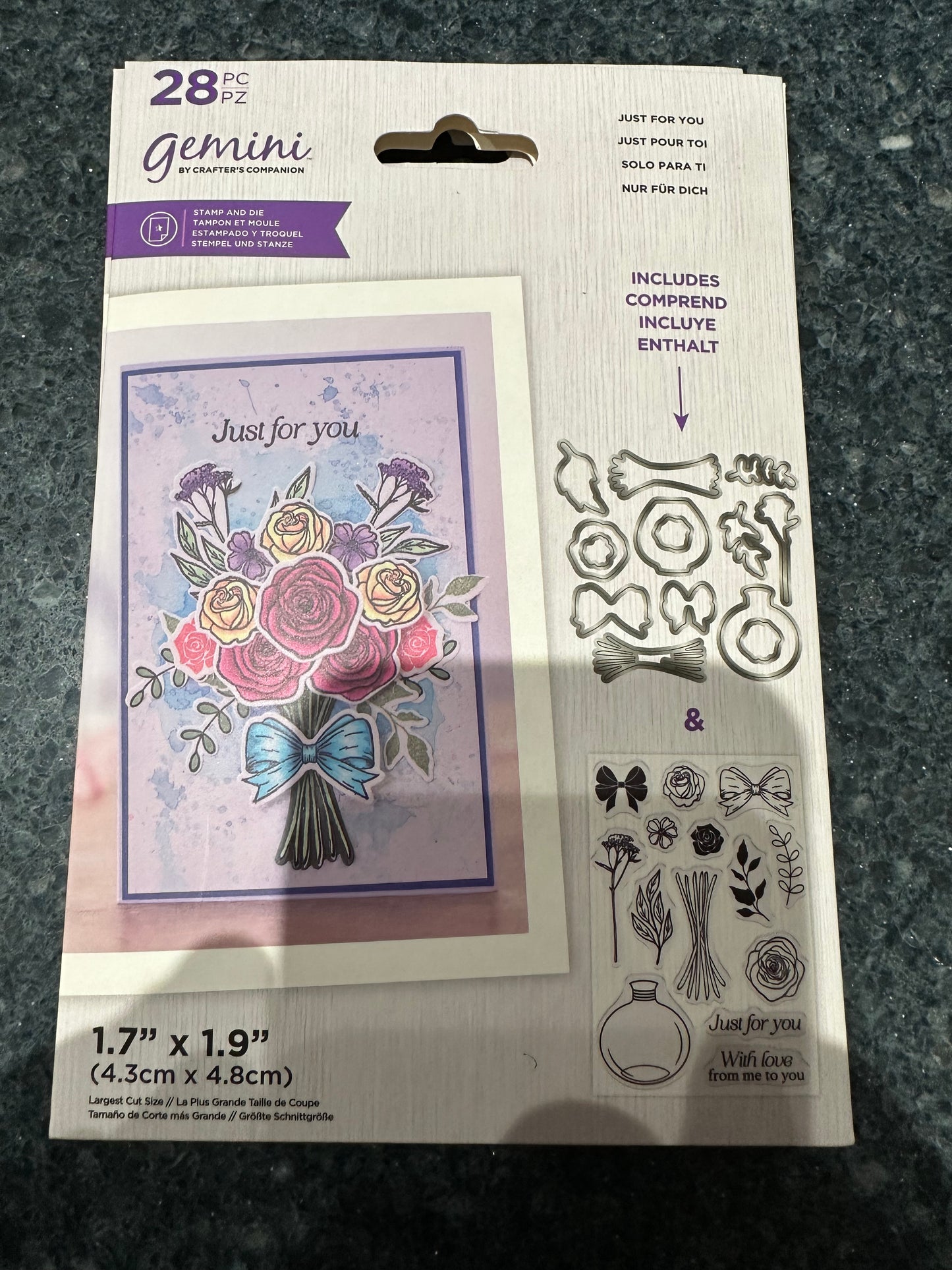 Part of a floral collection, the largest die measures 1.7" x 1.9" in this 28-piece set of stamps and dies. Includes a floral vase, greenery, flowers, bow, and the sentiments: Just for you and With love from me to you.